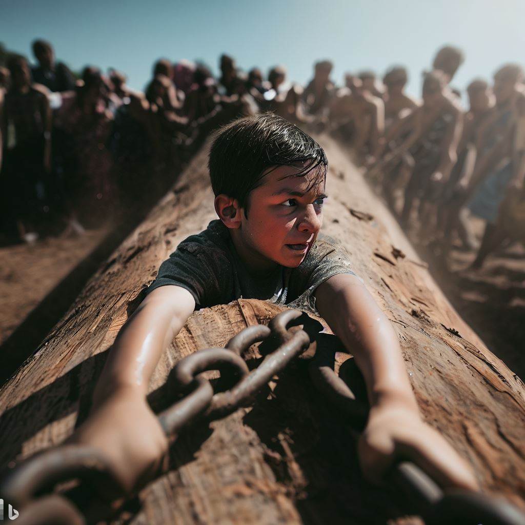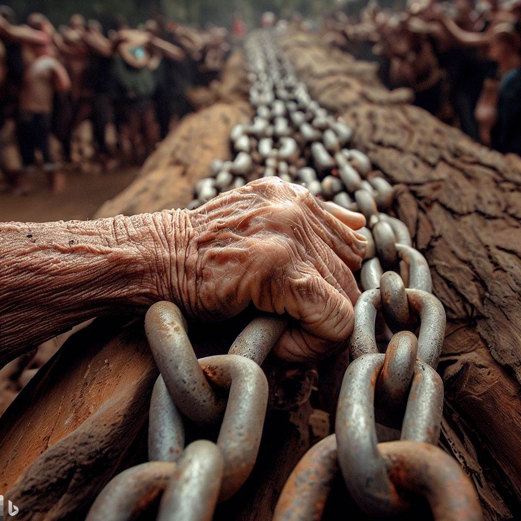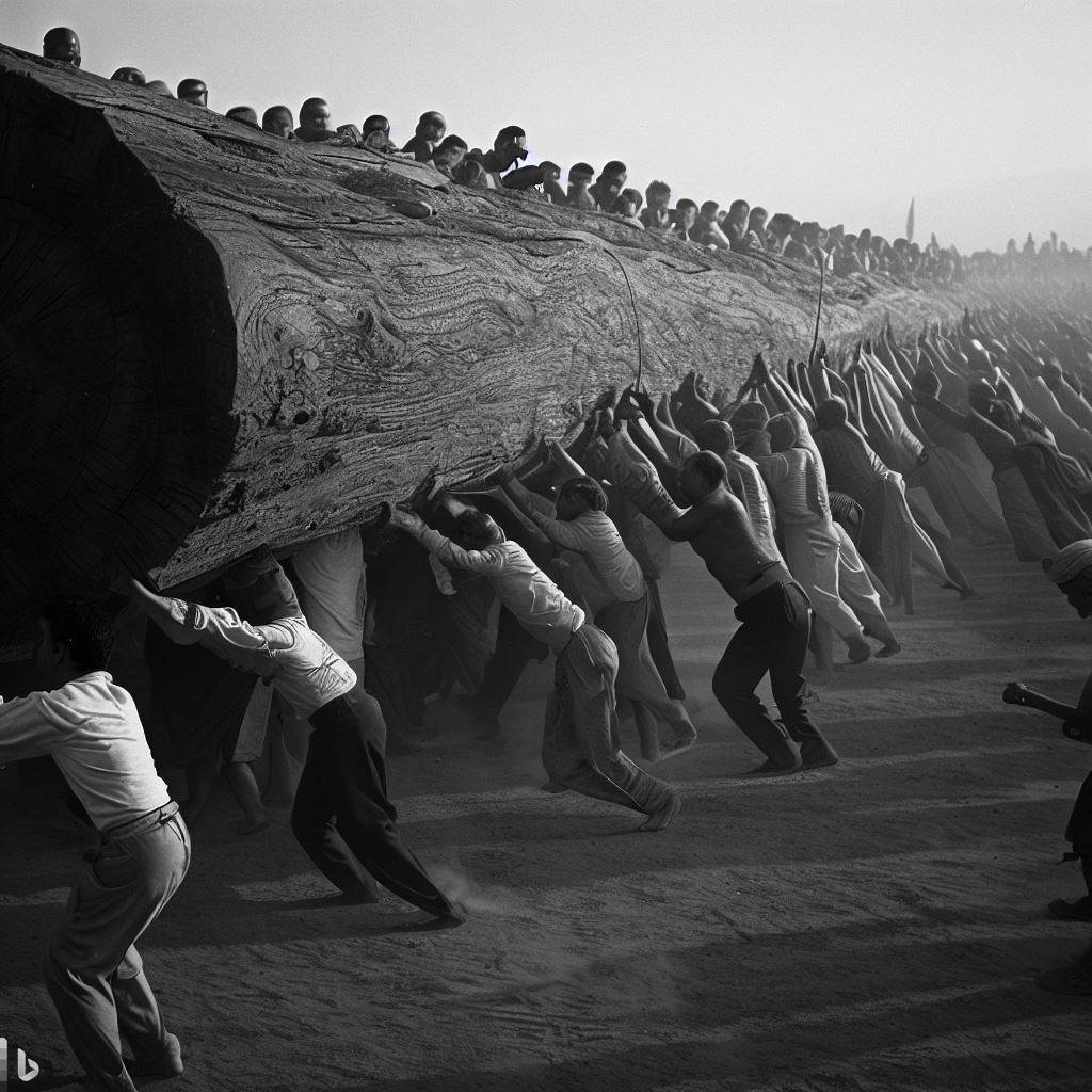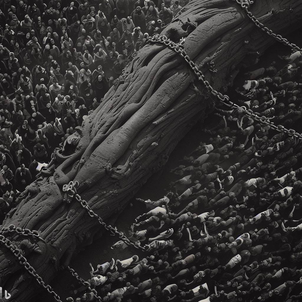"A gigantic log slowly slides through the dirt, carving everything in its path. Thousands of people of all ages and backgrounds cling to chains that were hammered into the log, serving as crude and simple handles. They strain against the chains with all their strength, moving ever forward, driven by faith or by fear. A man with old hands lets go of his chains and steps aside, out of the way of the others. He rests for a moment, watching the endless line of pushers move past him, unnoticed by them. He turns and walks along the trench, observing the path he has carved with his life. He reaches the end of the trench, where a new society grows. He takes his place among those who also finished their infinite push. The chains he left are still swinging, empty. Until two tiny hands grip them tight."