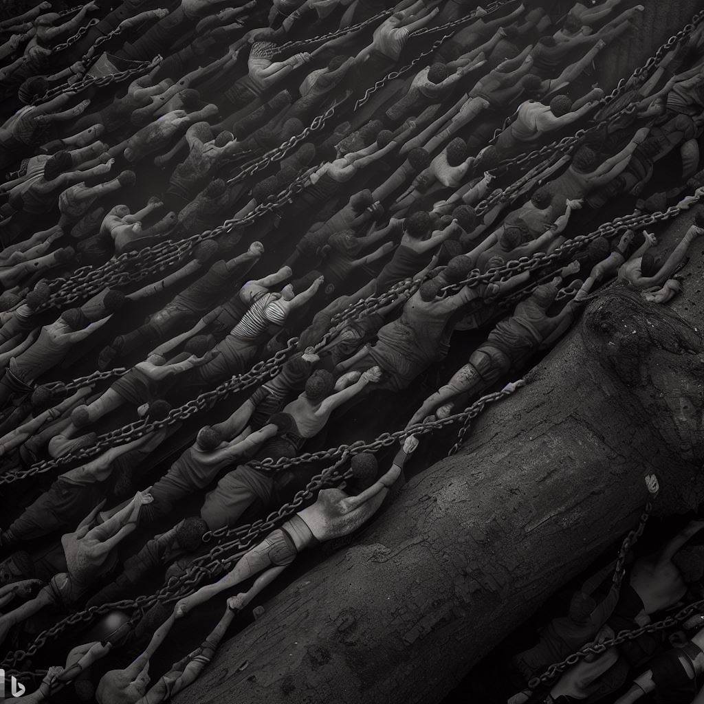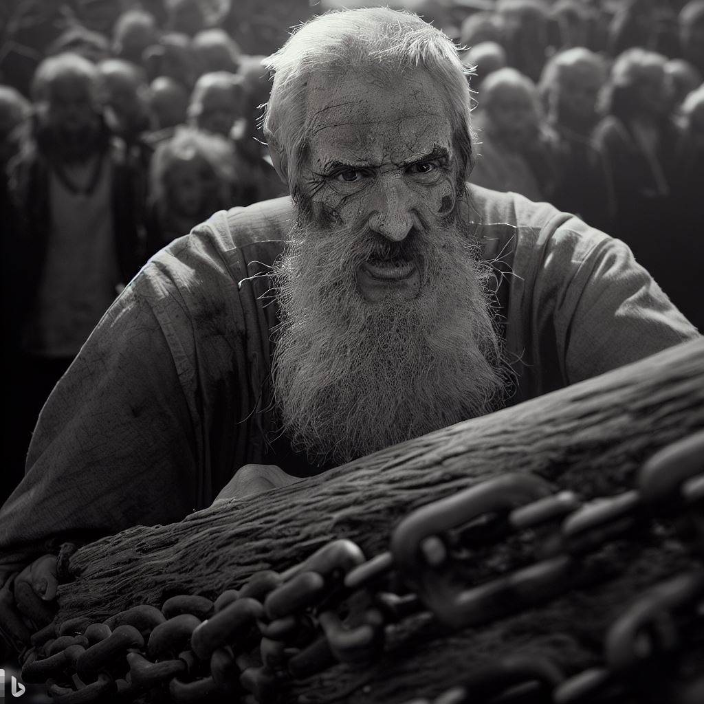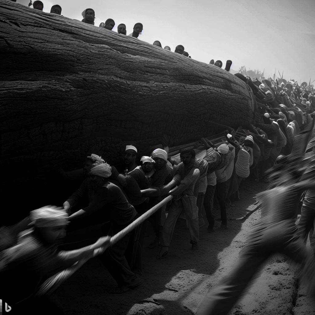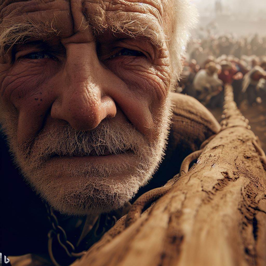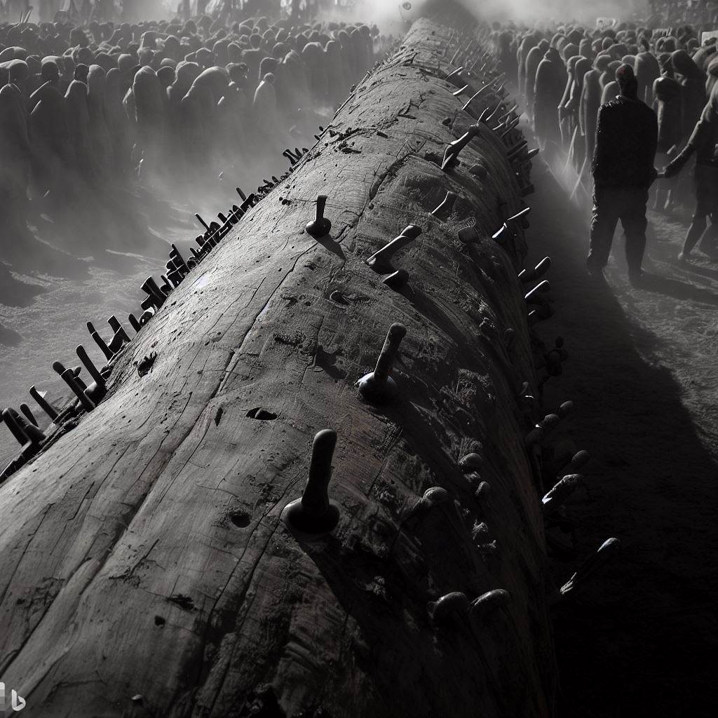 "A gigantic log slowly slides through the dirt, carving everything in its path. Thousands of people of all ages and backgrounds cling to chains that were hammered into the log, serving as crude and simple handles. They strain against the chains with all their strength, moving ever forward, driven by faith or by fear. A man with old hands lets go of his chains and steps aside, out of the way of the others. He rests for a moment, watching the endless line of pushers move past him, unnoticed by them. He turns and walks along the trench, observing the path he has carved with his life. He reaches the end of the trench, where a new society grows. He takes his place among those who also finished their infinite push. The chains he left are still swinging, empty. Until two tiny hands grip them tight."