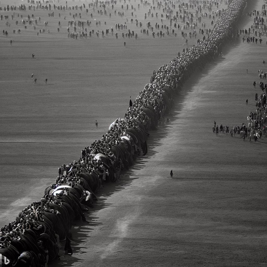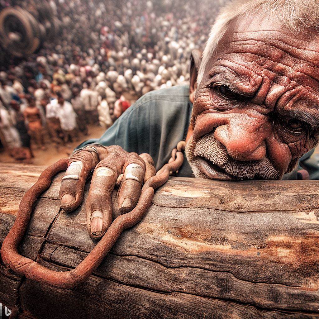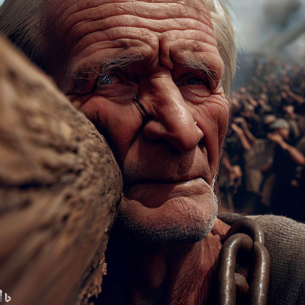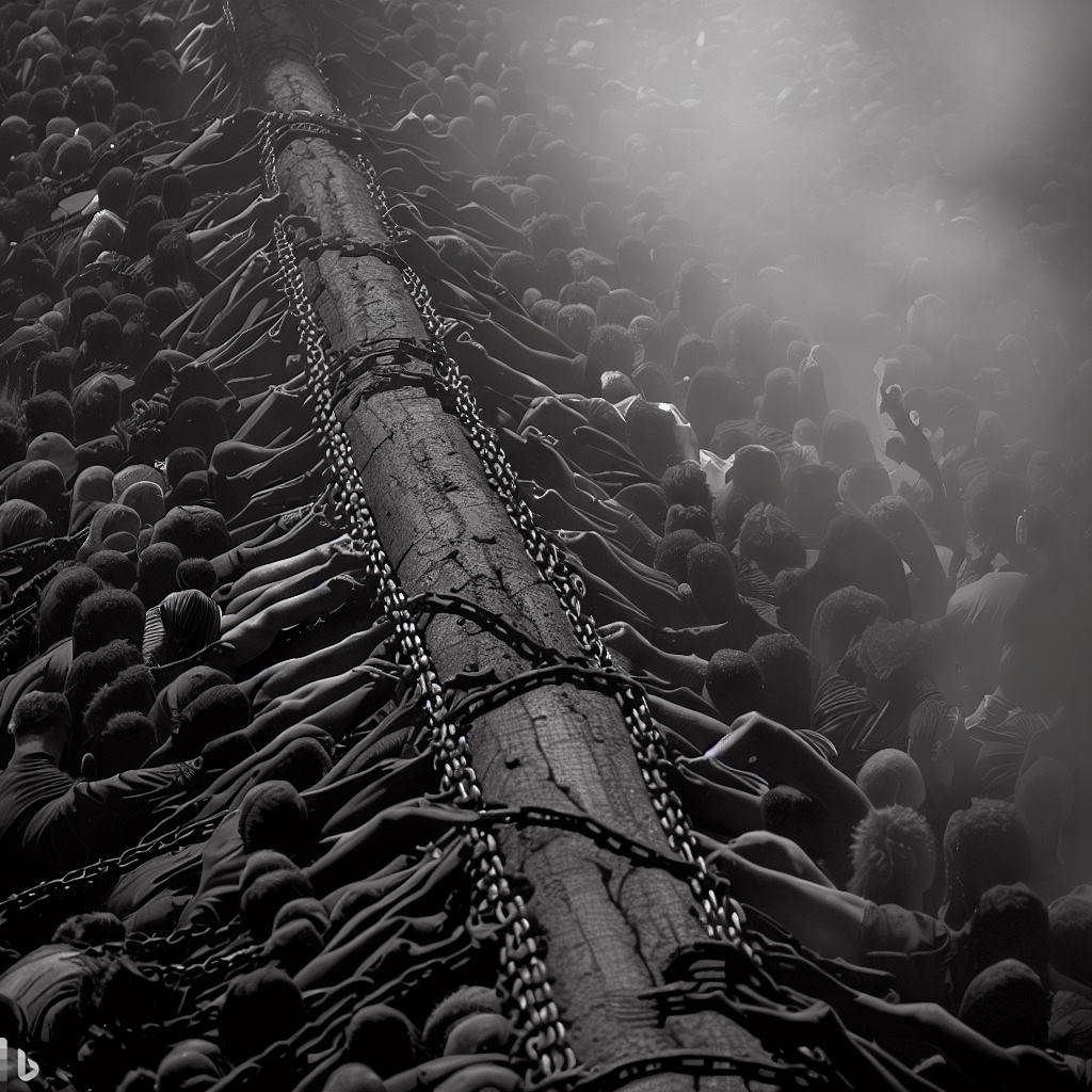 "A gigantic log slowly slides through the dirt, carving everything in its path. Thousands of people of all ages and backgrounds cling to chains that were hammered into the log, serving as crude and simple handles. They strain against the chains with all their strength, moving ever forward, driven by faith or by fear. A man with old hands lets go of his chains and steps aside, out of the way of the others. He rests for a moment, watching the endless line of pushers move past him, unnoticed by them. He turns and walks along the trench, observing the path he has carved with his life. He reaches the end of the trench, where a new society grows. He takes his place among those who also finished their infinite push. The chains he left are still swinging, empty. Until two tiny hands grip them tight."
