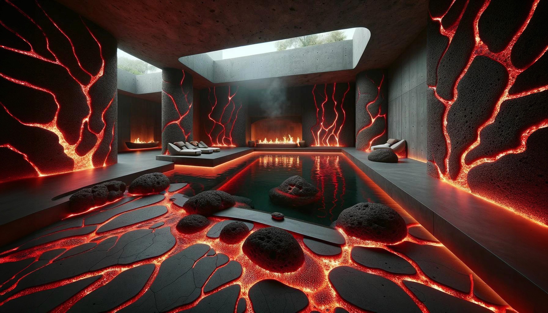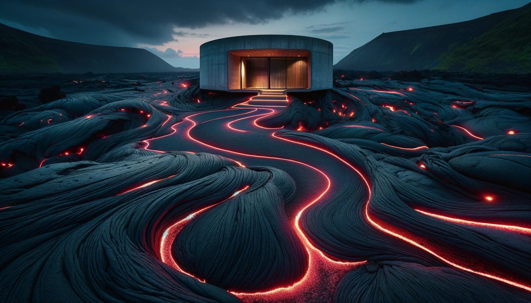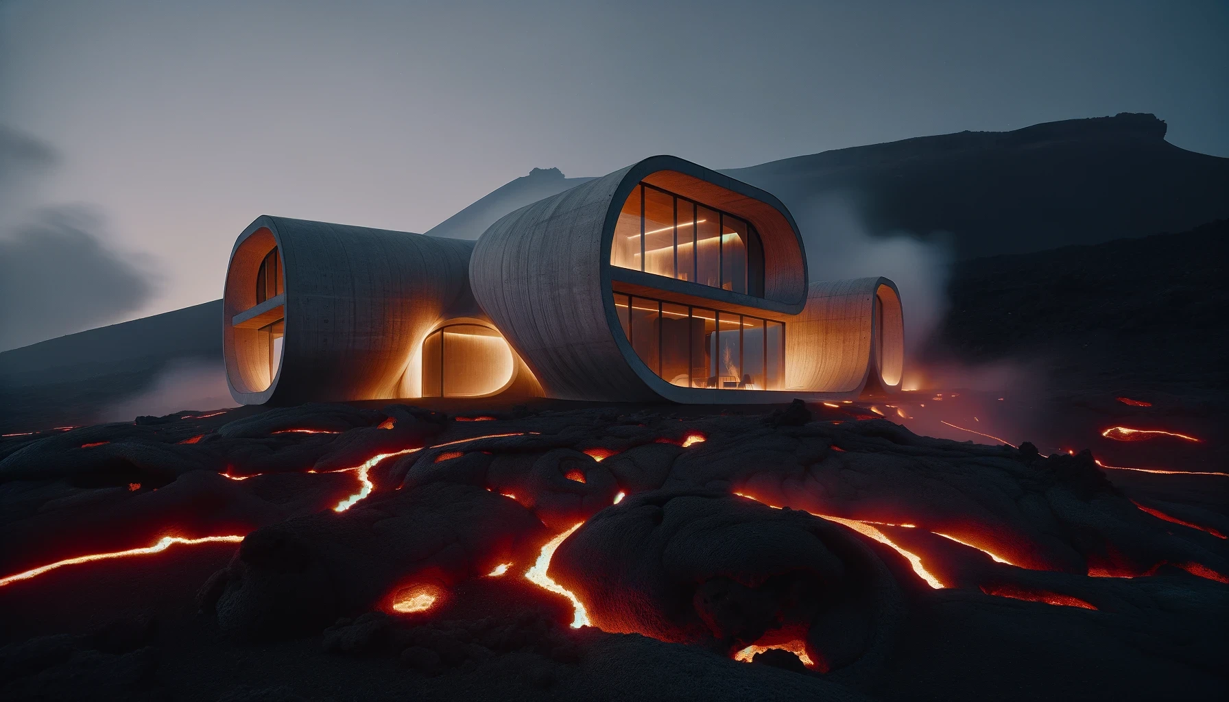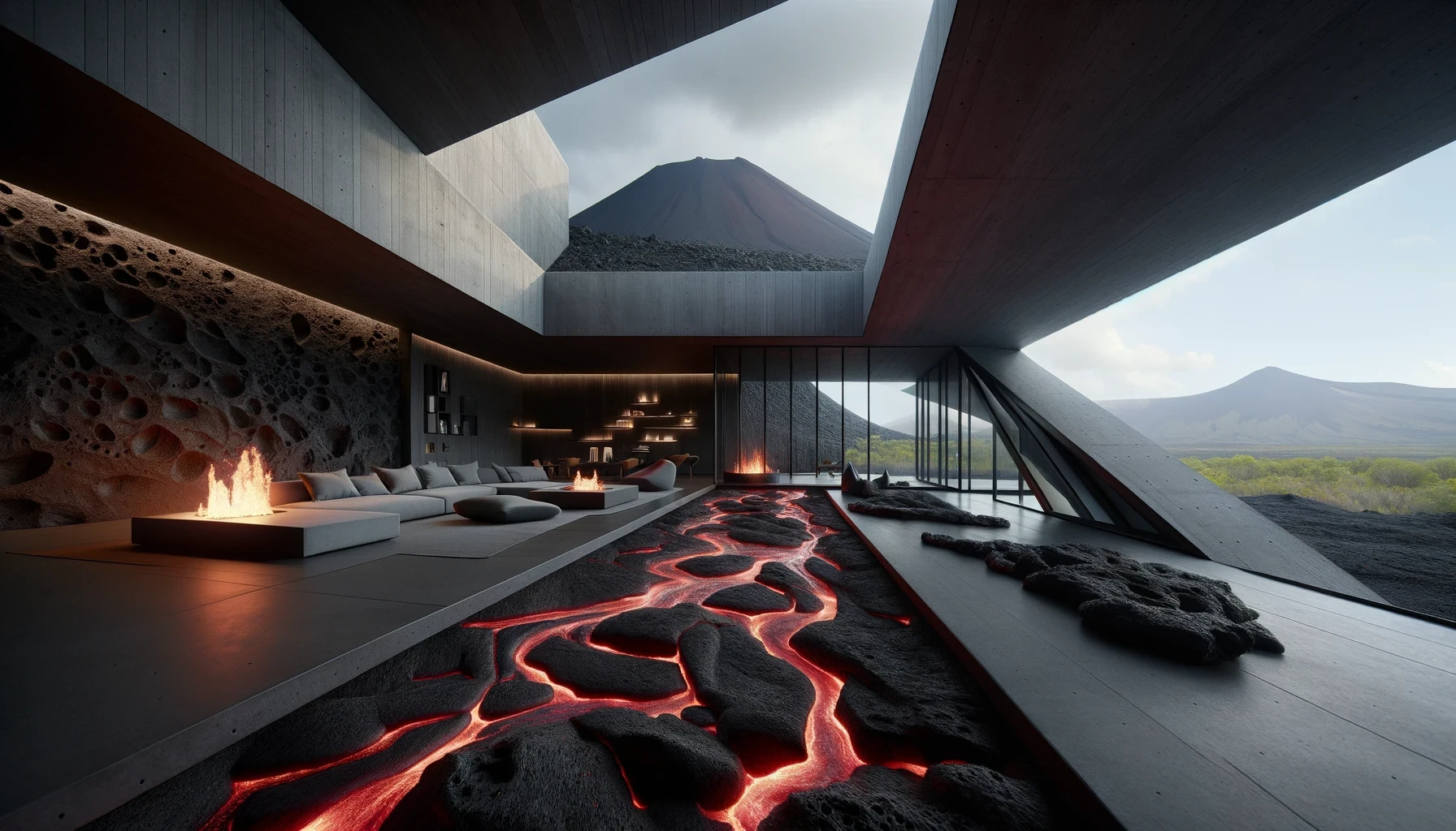 Nestled in the heart of a dormant volcano lies "Molten Manor," a modern marvel of architecture that dares to embrace the raw, untamed spirit of the earth. This brutalist masterpiece, sculpted from the very essence of magma, stands as a testament to human ingenuity and the primal forces of nature. With walls that curve and flow like the lava it honors, the home is a labyrinth of light and shadow, where the porous textures of volcanic rock meet sleek, modern lines in an elegant dance of contrasts. The heart of the home beats with glowing veins of red lava, illuminating the space with a warmth that is both inviting and awe-inspiring.