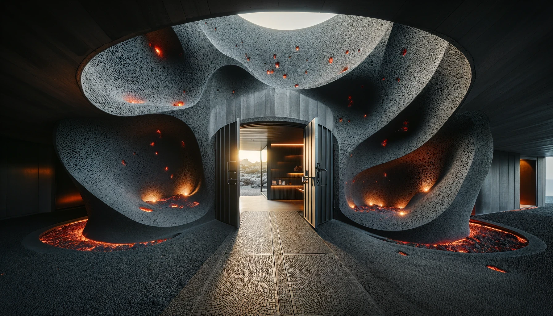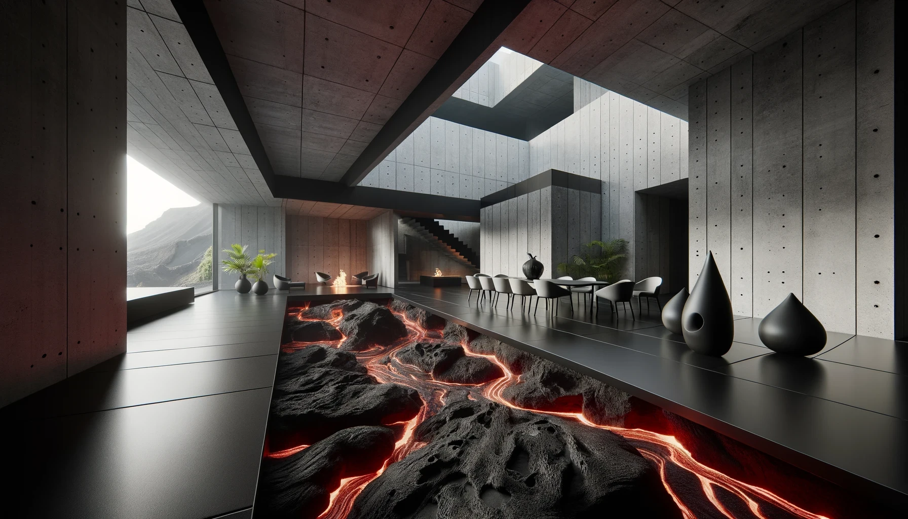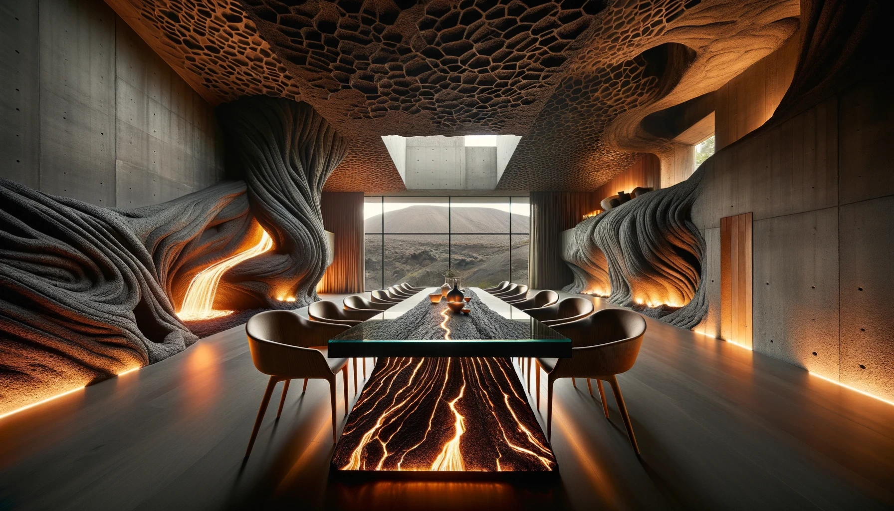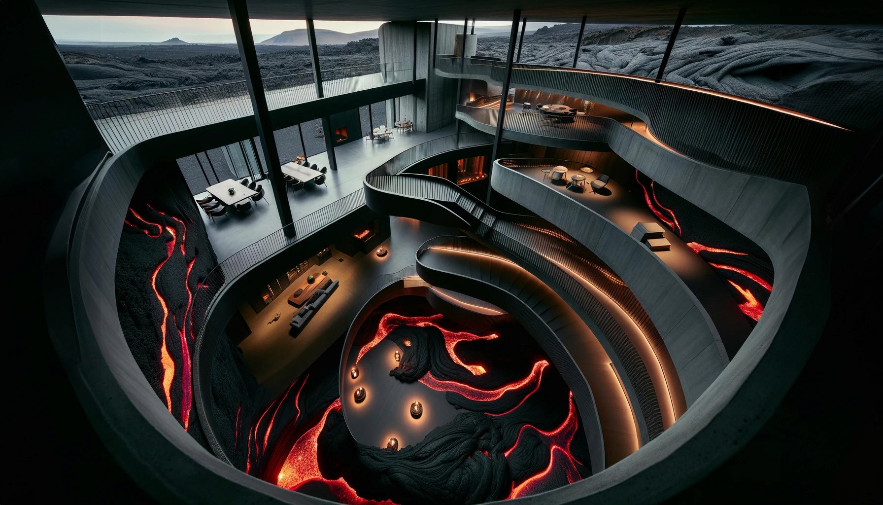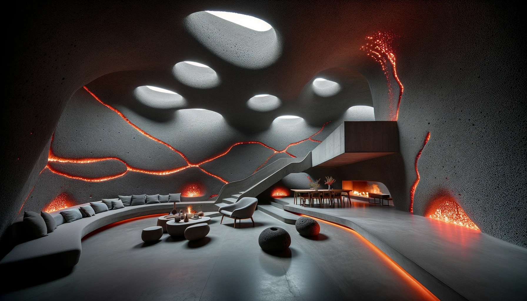 Nestled in the heart of a dormant volcano lies "Molten Manor," a modern marvel of architecture that dares to embrace the raw, untamed spirit of the earth. This brutalist masterpiece, sculpted from the very essence of magma, stands as a testament to human ingenuity and the primal forces of nature. With walls that curve and flow like the lava it honors, the home is a labyrinth of light and shadow, where the porous textures of volcanic rock meet sleek, modern lines in an elegant dance of contrasts. The heart of the home beats with glowing veins of red lava, illuminating the space with a warmth that is both inviting and awe-inspiring.