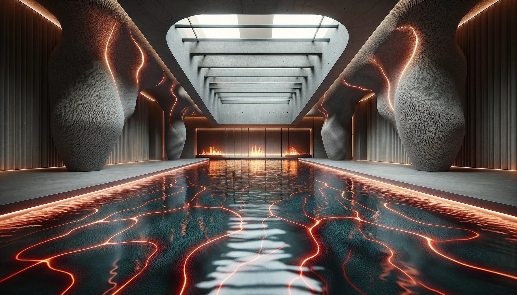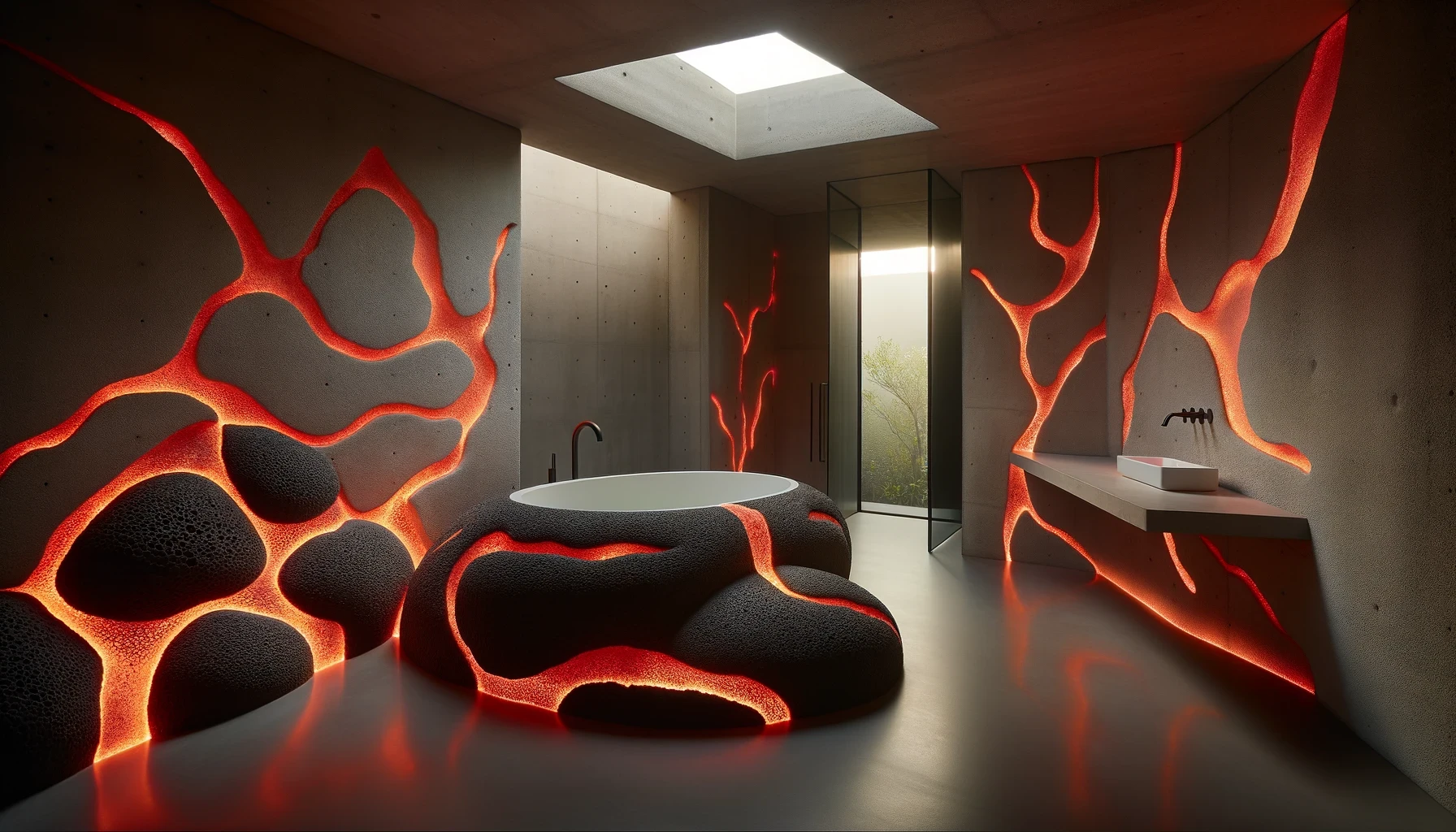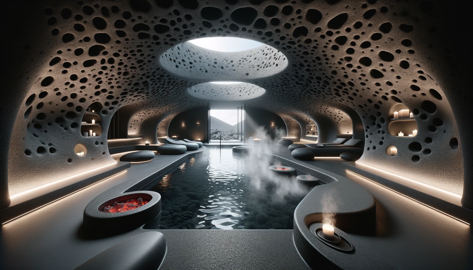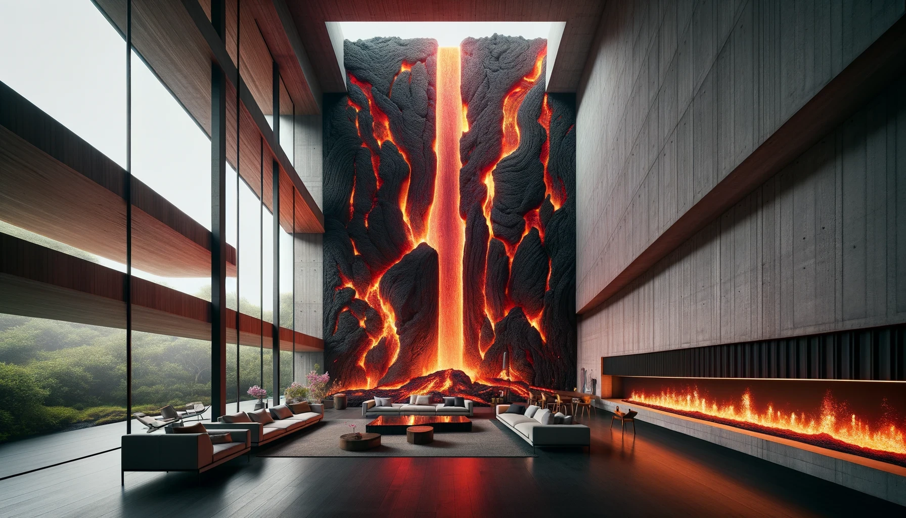 Nestled in the heart of a dormant volcano lies "Molten Manor," a modern marvel of architecture that dares to embrace the raw, untamed spirit of the earth. This brutalist masterpiece, sculpted from the very essence of magma, stands as a testament to human ingenuity and the primal forces of nature. With walls that curve and flow like the lava it honors, the home is a labyrinth of light and shadow, where the porous textures of volcanic rock meet sleek, modern lines in an elegant dance of contrasts. The heart of the home beats with glowing veins of red lava, illuminating the space with a warmth that is both inviting and awe-inspiring.