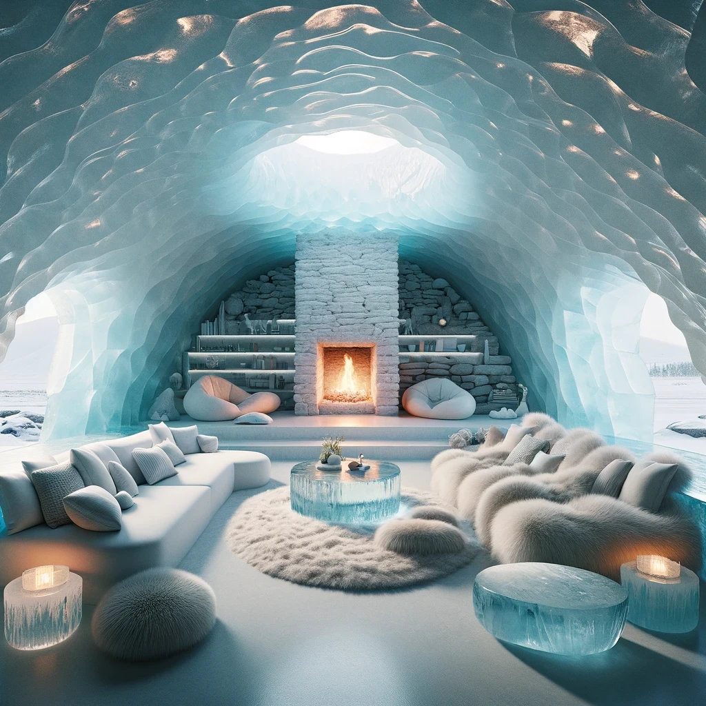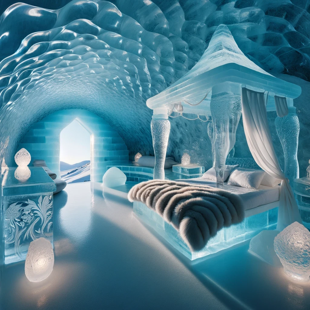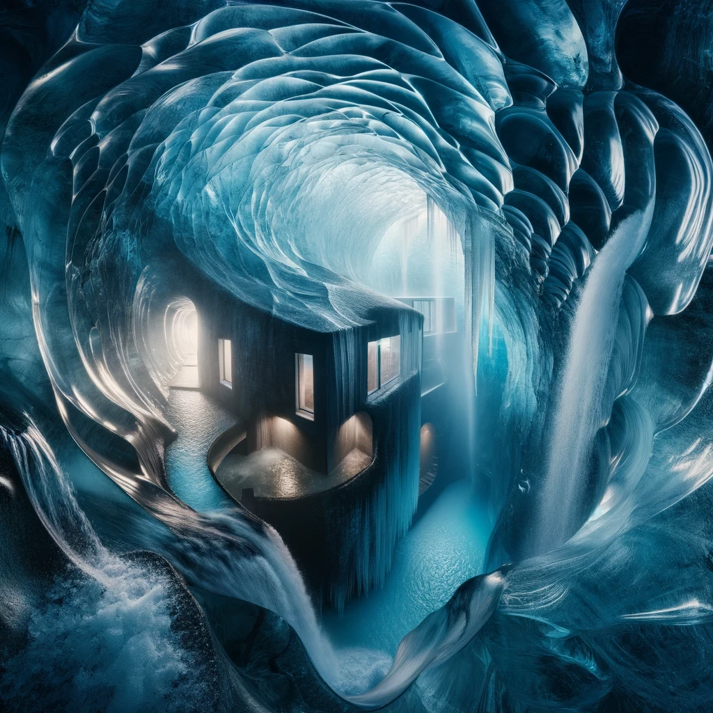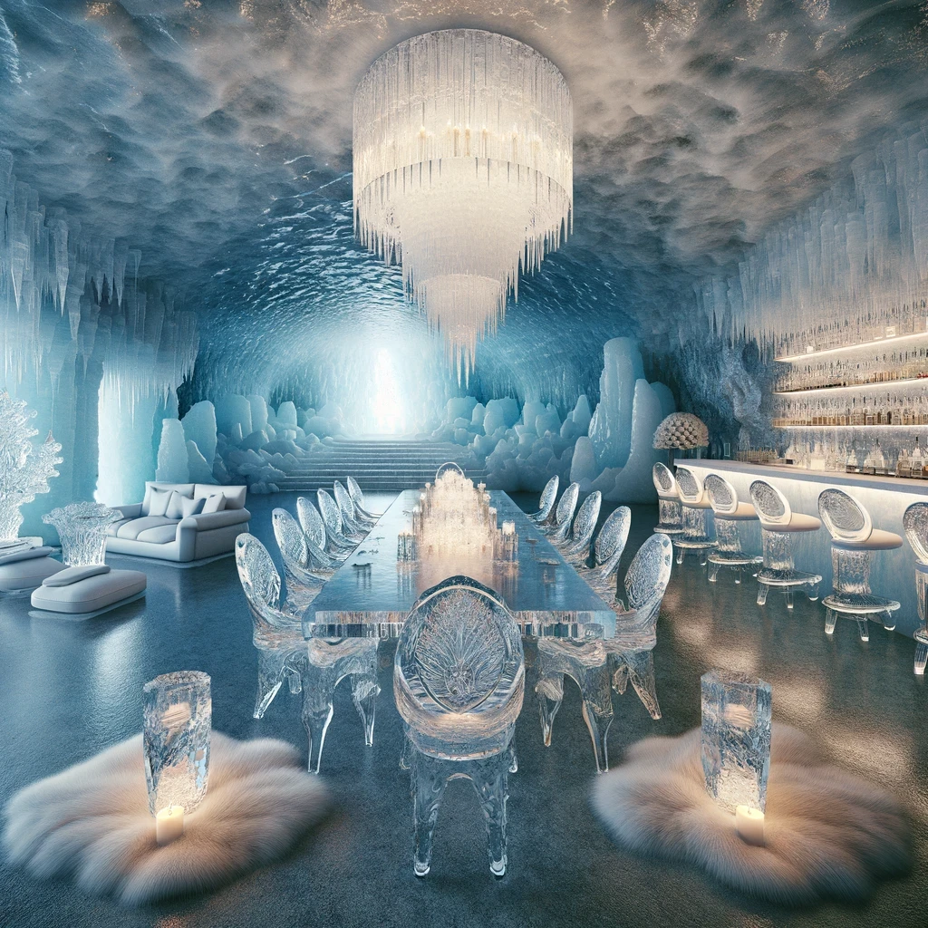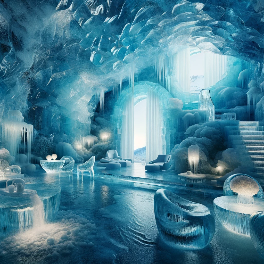 "Immerse yourself in the splendid isolation of the Palace Under the Ice, a sanctuary sculpted within the heart of an ancient glacier. Here lies an abode that transcends the ordinary, crafted for those who find solace in the embrace of ice and serenity. The Palace Under the Ice, stands as a seamless blend of crystalline walls and the flowing grace of waterfalls within. With no sharp angles to speak of, this dwelling boasts curves and arches that echo the glacier's ageless journey. Its translucent walls invite the dance of light and shadow, an eternal ballet cast by the polar sun as it waxes and wanes through the seasons. Furniture rises from the frosty ground like ice sculptures, their edges softened, their forms dictated by the whims of winter's touch. Each piece, from the chairs to the beds, is designed to merge indistinguishably with their frozen canvas, ensuring an uninterrupted panorama of the icy realm beyond. The very essence of the Palace is its communion with the natural world—where the stark beauty of the glacier is not merely a backdrop, but a constant, living presence. In this space, one does not simply view the ice; they exist within its story, enveloped in the profound purity of the Arctic.