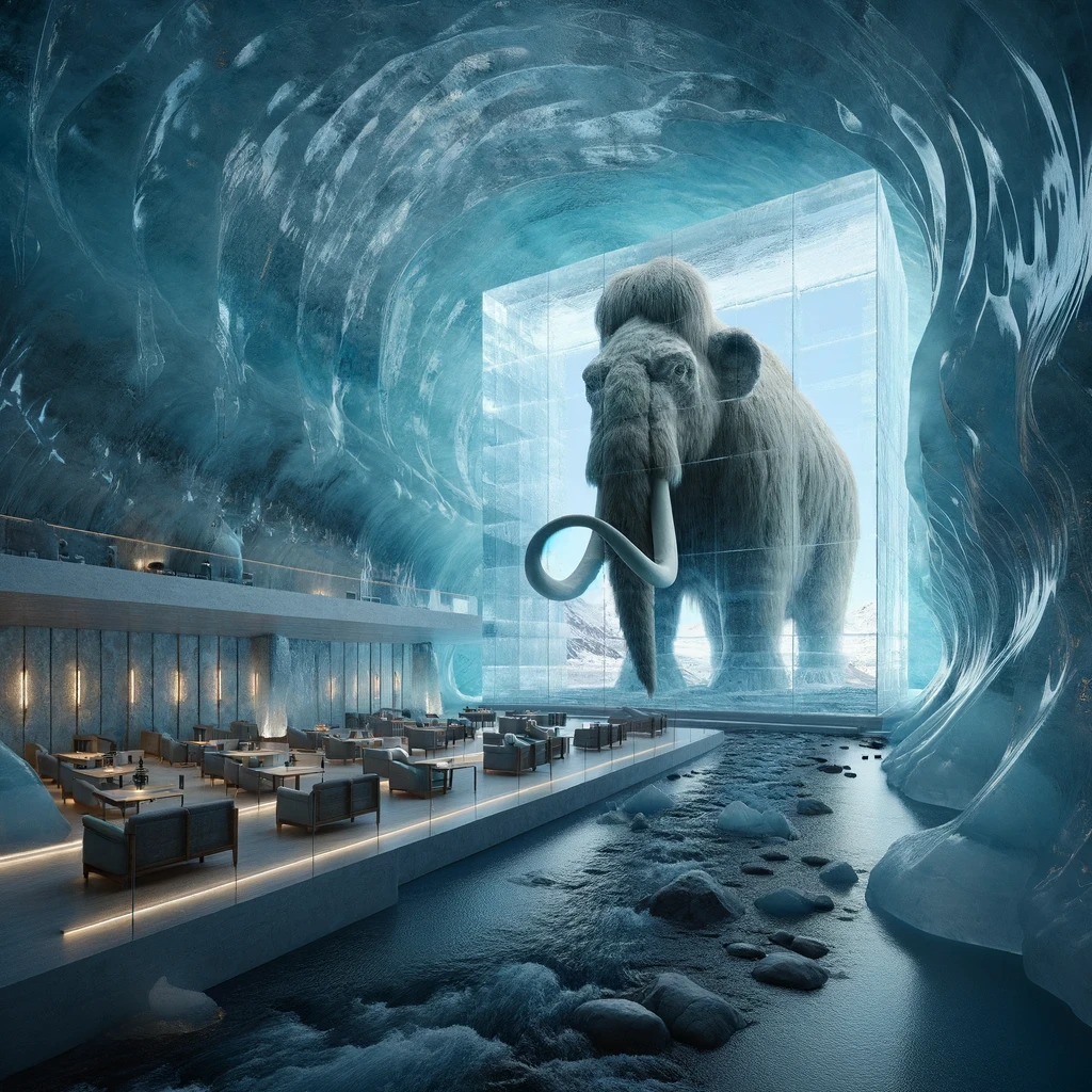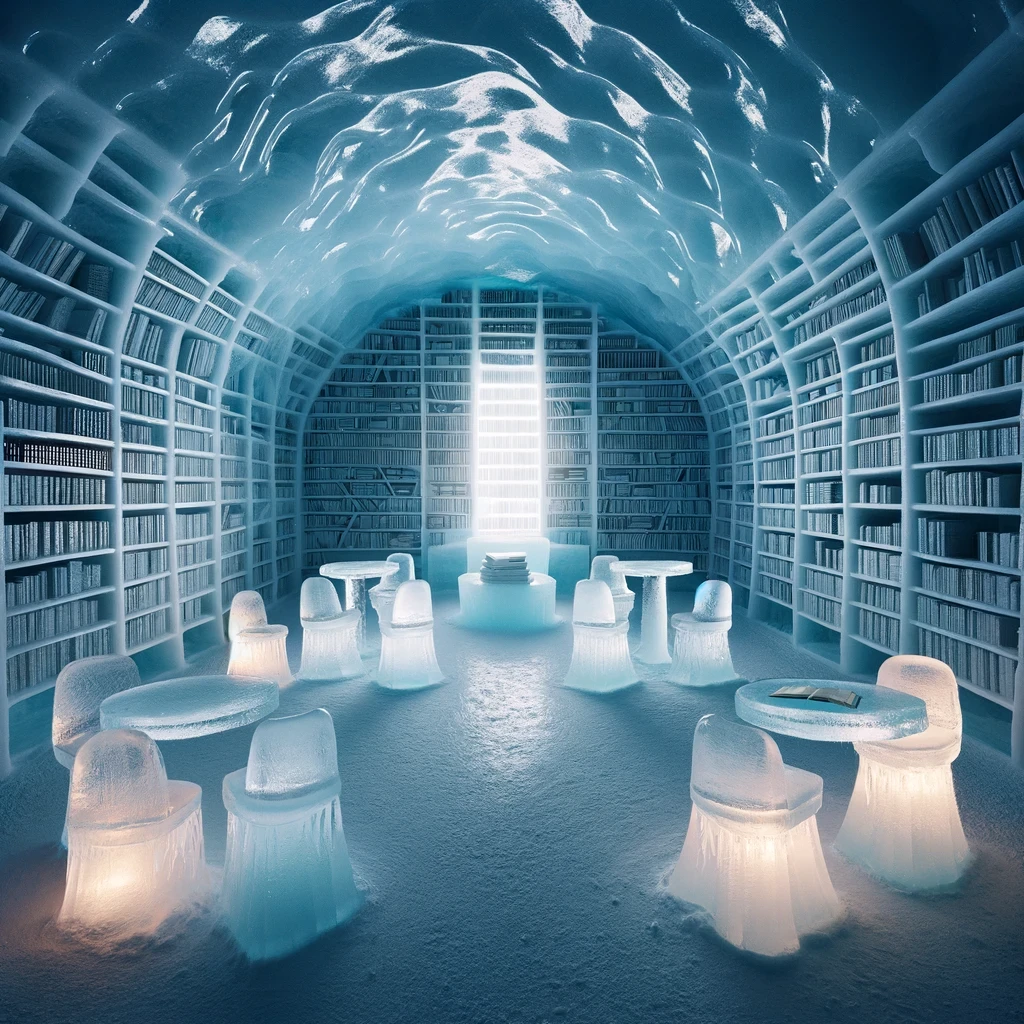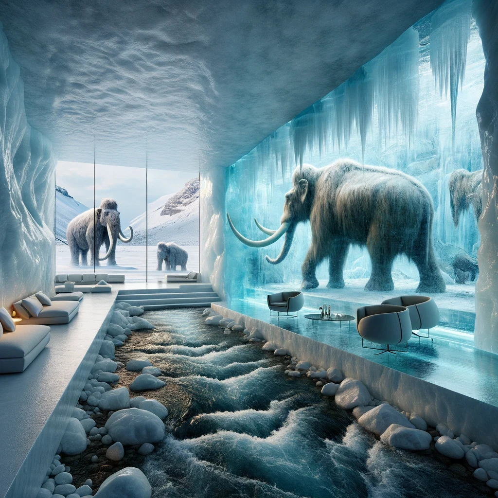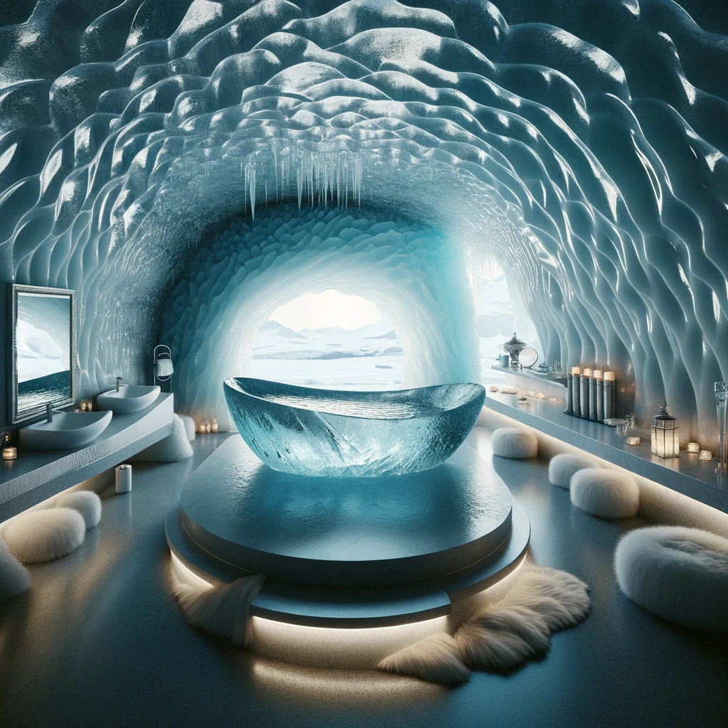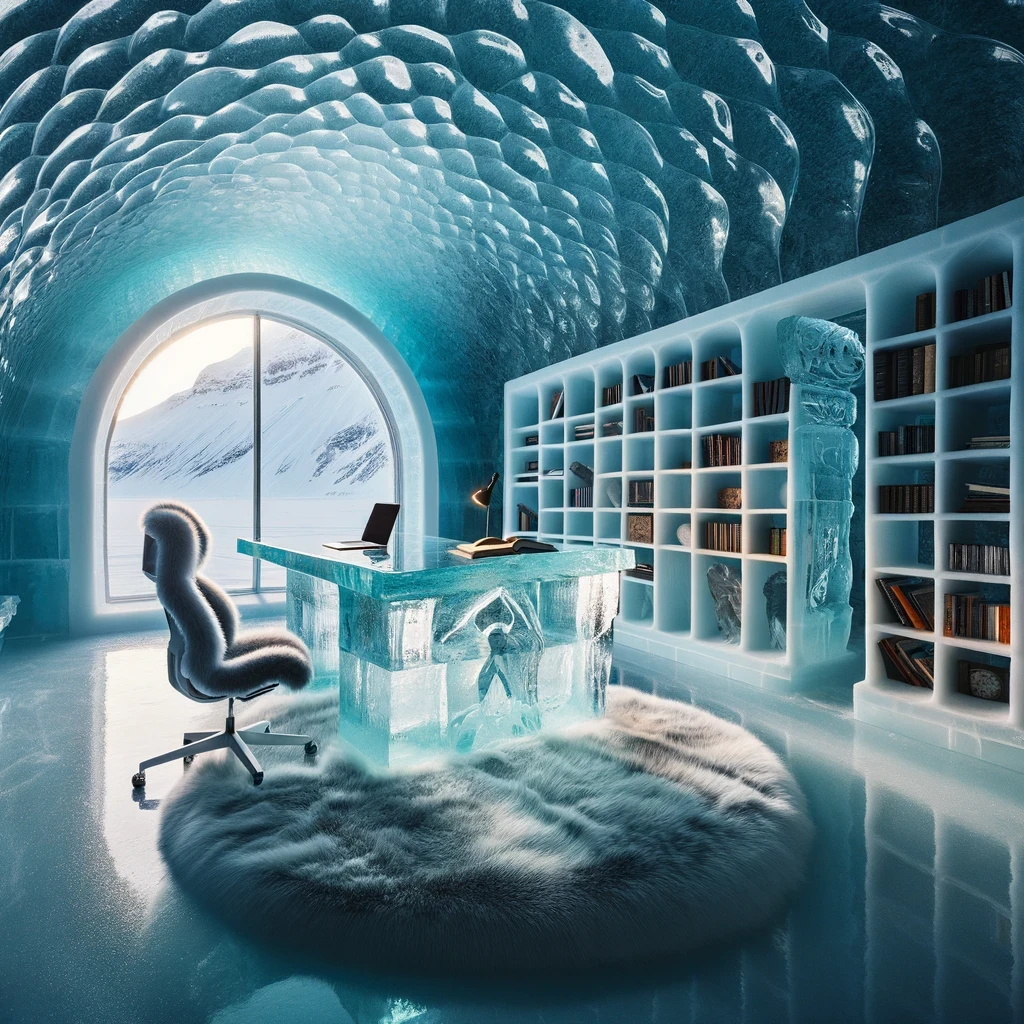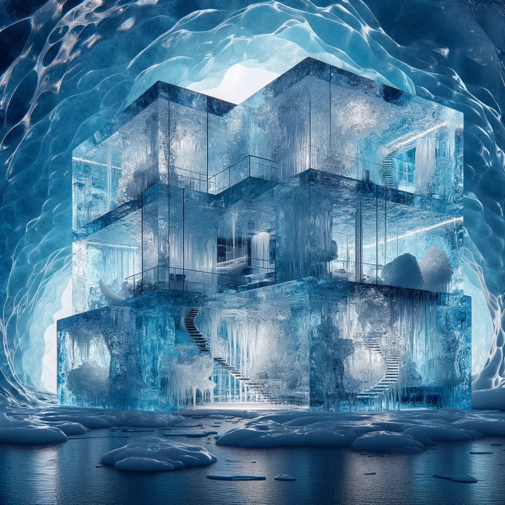"Immerse yourself in the splendid isolation of the Palace Under the Ice, a sanctuary sculpted within the heart of an ancient glacier. Here lies an abode that transcends the ordinary, crafted for those who find solace in the embrace of ice and serenity. The Palace Under the Ice, stands as a seamless blend of crystalline walls and the flowing grace of waterfalls within. With no sharp angles to speak of, this dwelling boasts curves and arches that echo the glacier's ageless journey. Its translucent walls invite the dance of light and shadow, an eternal ballet cast by the polar sun as it waxes and wanes through the seasons. Furniture rises from the frosty ground like ice sculptures, their edges softened, their forms dictated by the whims of winter's touch. Each piece, from the chairs to the beds, is designed to merge indistinguishably with their frozen canvas, ensuring an uninterrupted panorama of the icy realm beyond. The very essence of the Palace is its communion with the natural world—where the stark beauty of the glacier is not merely a backdrop, but a constant, living presence. In this space, one does not simply view the ice; they exist within its story, enveloped in the profound purity of the Arctic.