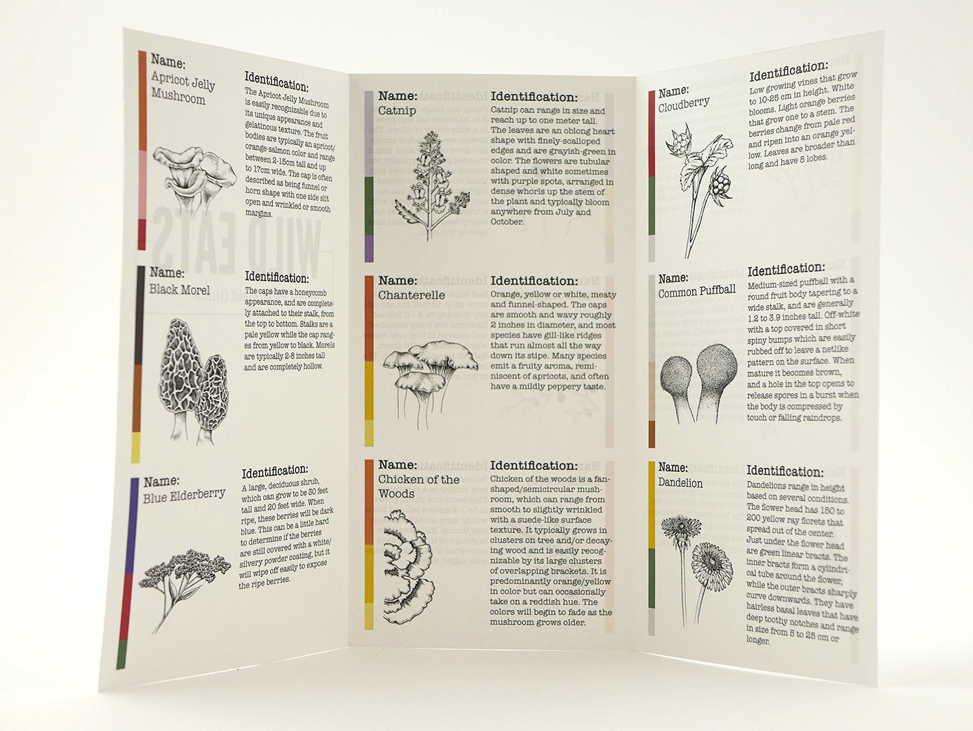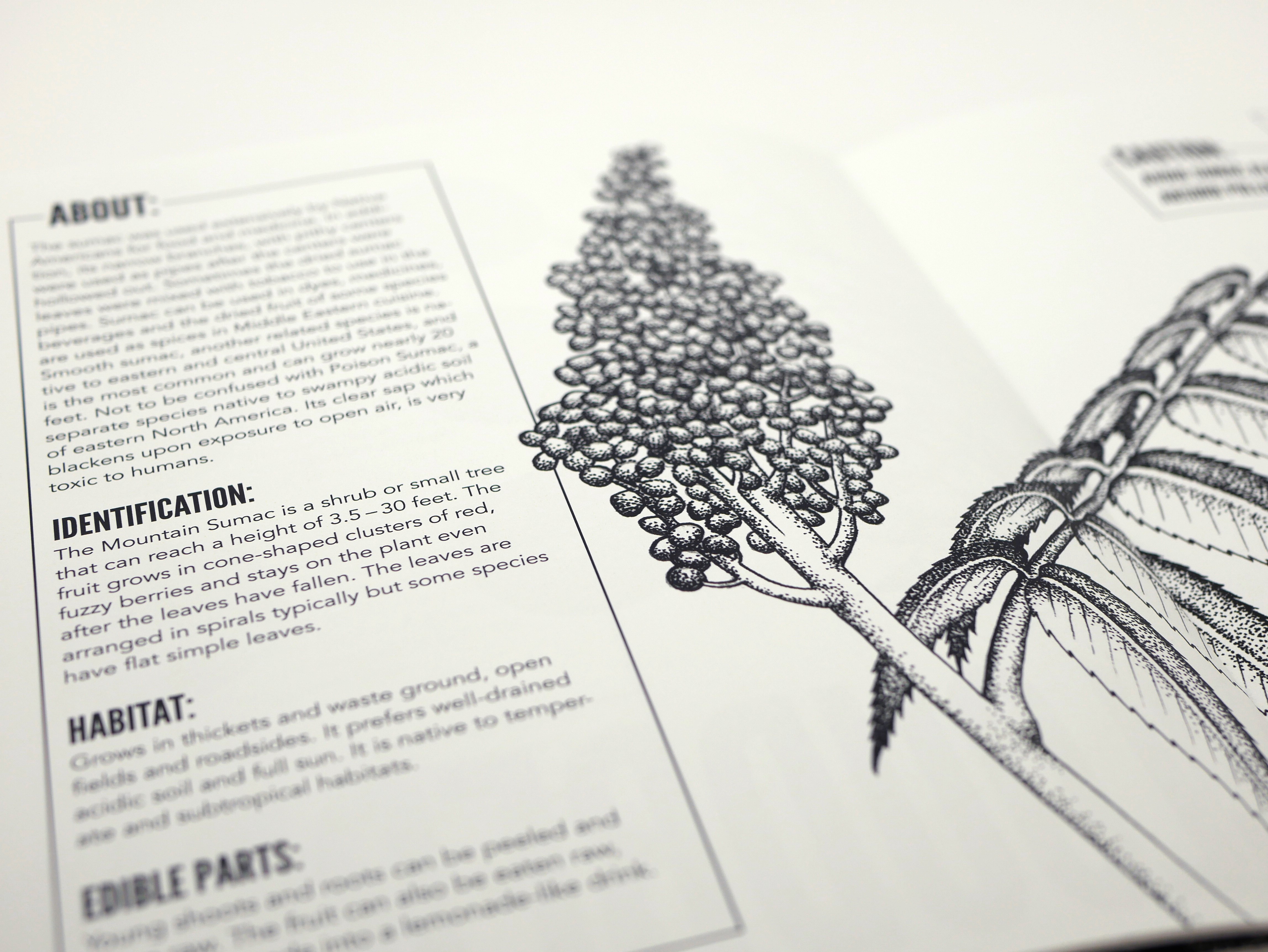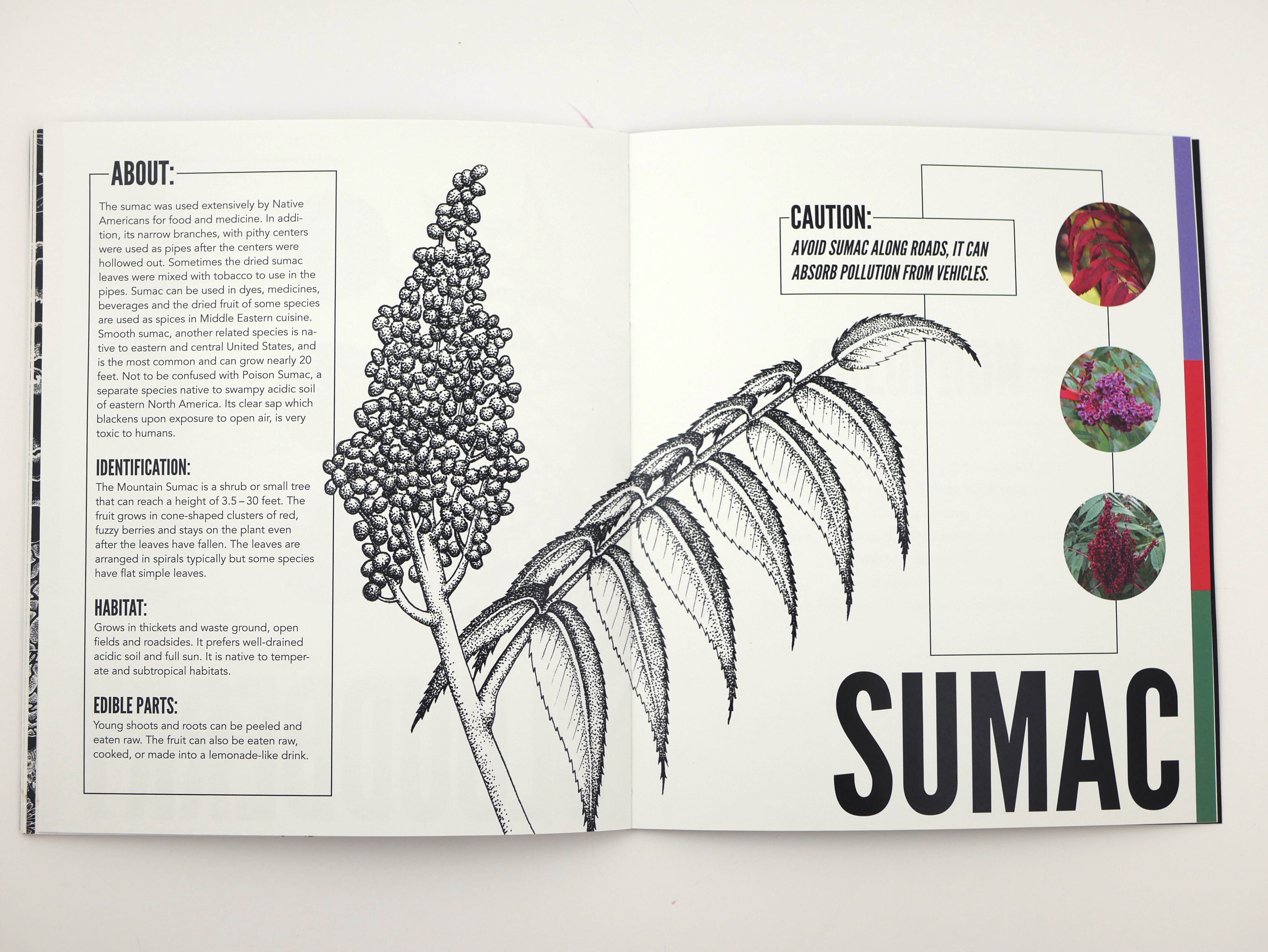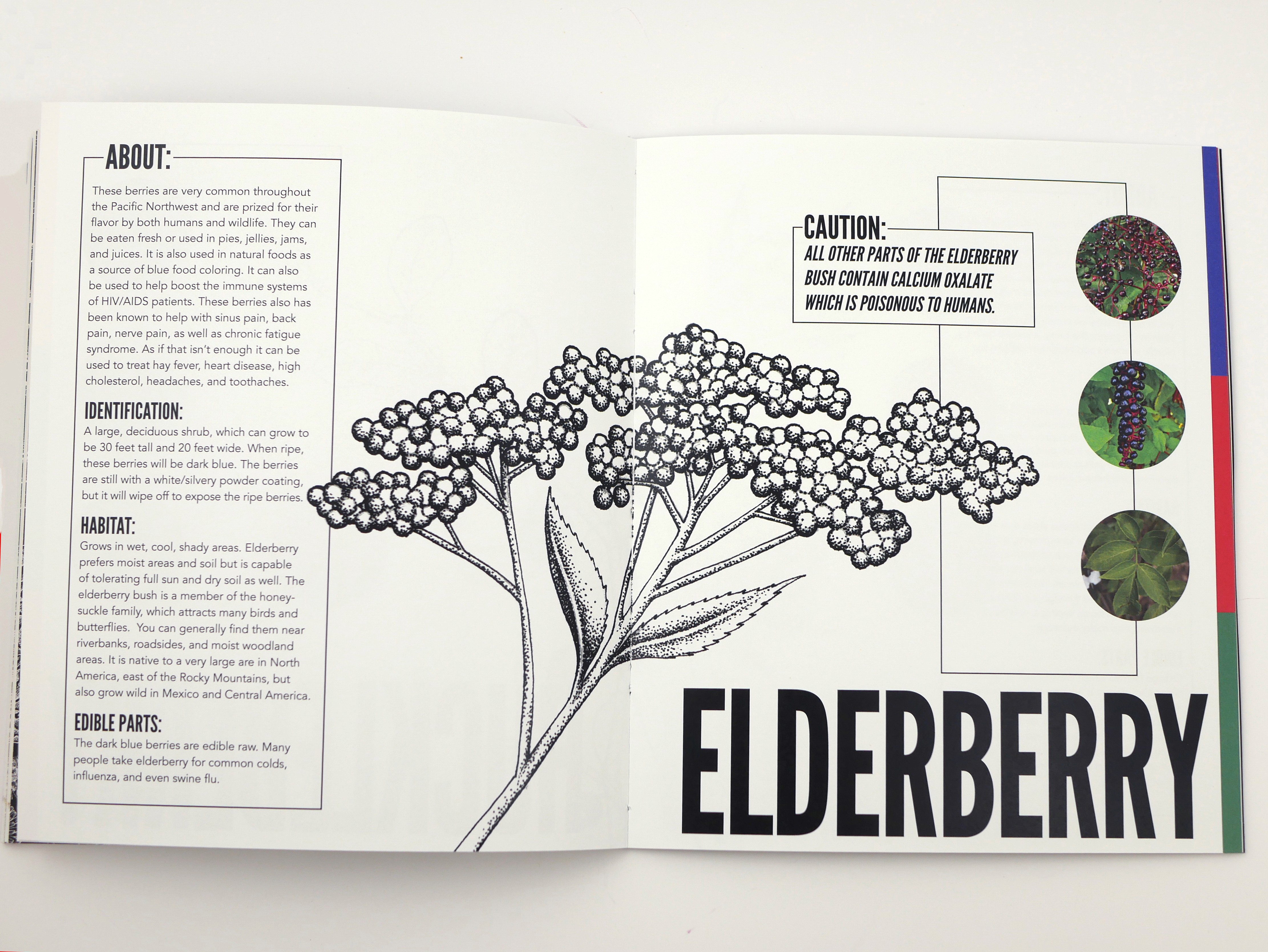 Wild Eats is a guidebook of edible plants in the Pacific North West. I created the page layouts including the typesetting, fonts, and color palettes. I also collected information and curated images. I worked with Julia Hermsen (illustrations), Rogue Stoppard (layouts, asset collection), Blake Elliot (pull-out pamphlet, information collection), Casey Thomas (cover design, booklet construction and printing), Sara Von Krosigk (ideation and mood boards). Made in Adobe InDesign.